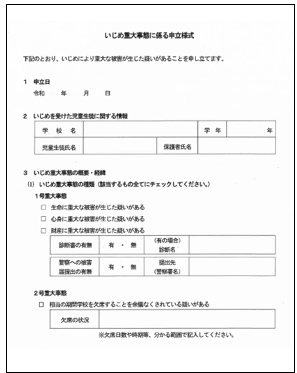 いじめにより重大な被害が生じた疑いがあることを申し立てる必要があります。こちらからダウンロードしていただけます。